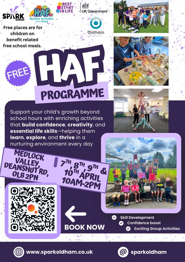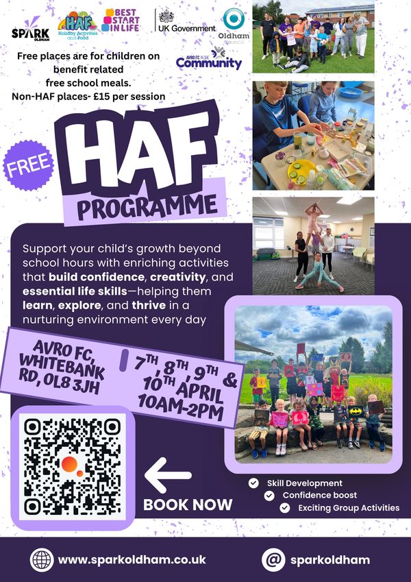 Join Spark Oldham this Easter for fun, active and engaging Holiday Activities & Food (HAF) sessions for children aged 5–16. Our sessions are designed to keep children active, social and supported during the school holidays, with a range of sports, games, crafts and team activities—plus a healthy meal provided each day.